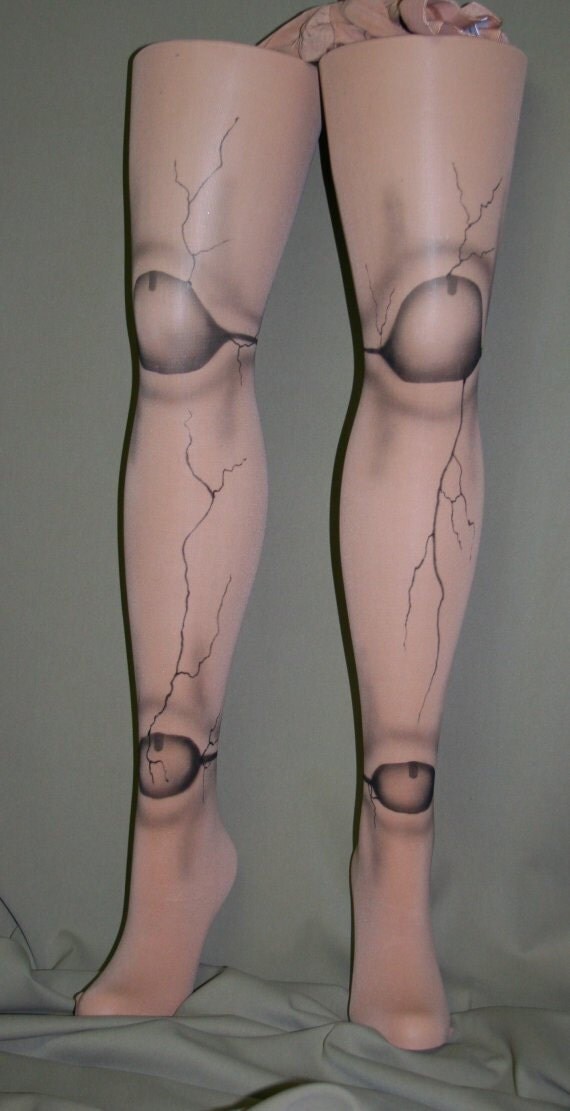 Tights with doll joints for knees and ankles, golden zippers, tattered and torn, and not least, the adorable black cat thigh high tights. Great tights to go with Doll Halloween Costumes for Kids and Adults!